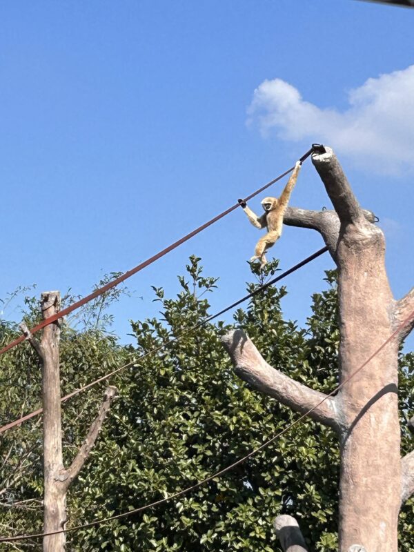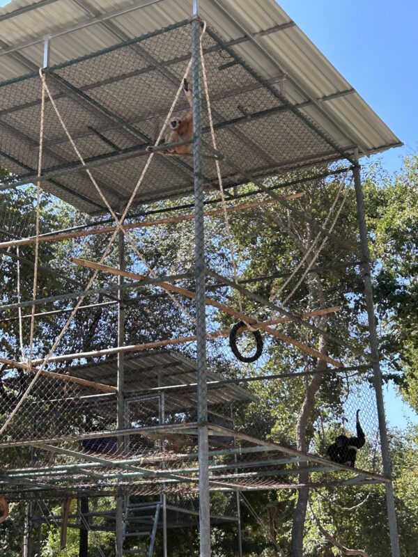 Next, we went through double gates into an enormous enclosure with high chainlink fencing. In here, the monkeys live in their own enclosures, with little bridges to connect the groups when they want to socialize. There’s also an entire herd of deer in here! They stampede past us several times during our walk through this vast area.