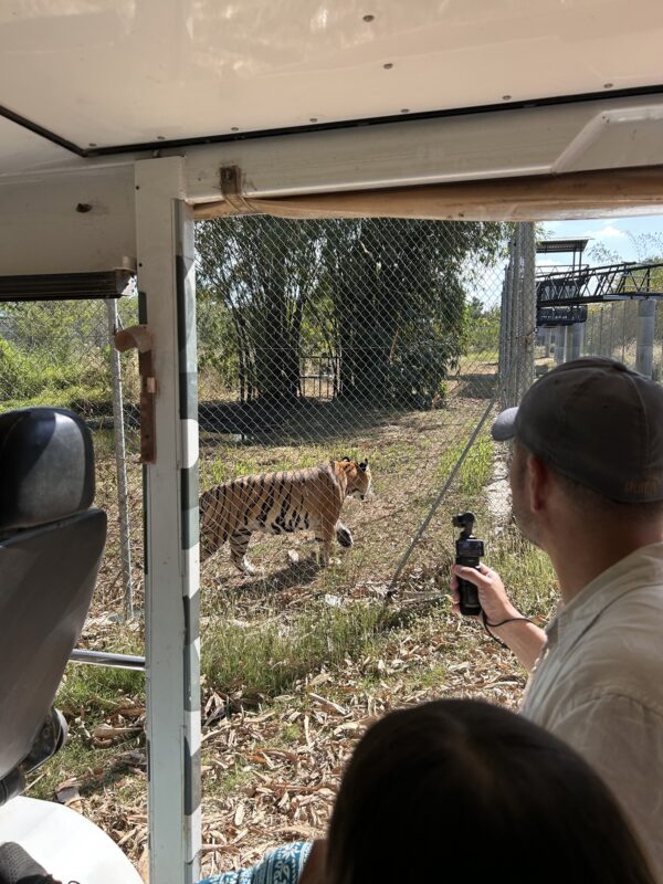 Our next area is the tiger sanctuary. This is where we learn that astounding fact about tigers in the wild vs tigers in Texas. When our guide lists the types of big cats they have here at the sanctuary, she says tigers, leopards, and fishing cats. I had to ask her, what on Earth is a fishing cat? It’s smaller than a tiger, has webbed feet, and some say it barks like a dog!