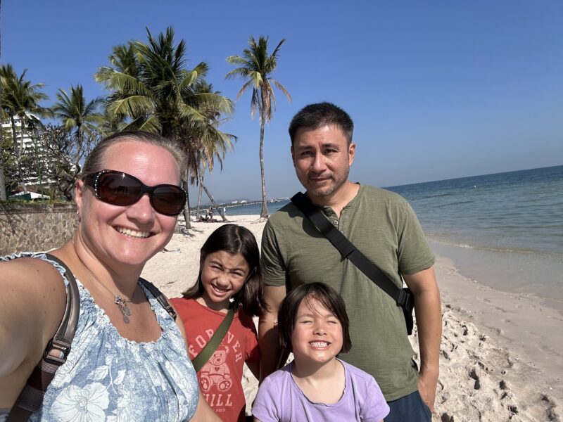 We go back up to the condo, repack to bring all the waters, change shoes and grab a Grab to go to Hua Hin beach. We’ve actually never been. It’s an excursion and a half, further than the furthest of our regular malls, and then the Grab lets us off when cars have to stop and only motorcycles can continue. We go down the alley with vendors selling flip flops, alcohol, beach towels and everything inbetween, until we reach the beach. The beach is narrow, it is high tide here too, of course, but there’s a beach!