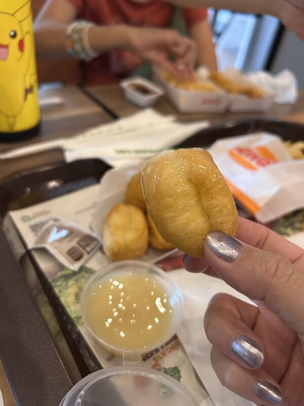 The car drops us off at Market Village, we’re all ready for a snack by now. We’re here so early, the mall isn’t even open yet! It’s 10.10am and the mall opens at 10.30am. This is the only reason we end up going inside Burger King for a snack, otherwise we wouldn’t have set foot in there. Téa wants chicken nuggets, Maylin wants fries. Seeing as Joe already tried the corn and taro fried pie on our first night in Bangkok, I order the second most unknown thing on the menu: Pattongo with condensed milk dipping sauce.