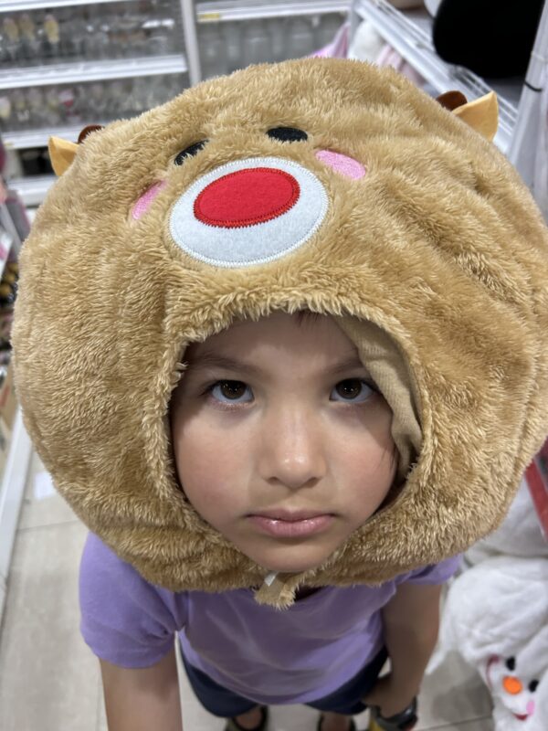 It’s almost time for Santa to arrive, and of course we have most everything ready for his arrival. After watching the movie Noelle last night, who knows, maybe Santa is a she this year? (Super cute and funny movie, highly recommended!) But we still have one or two more things to pick up, and our journey through the mall brings us to Daiso, where Maylin begs to try on this hat. She pulled it down to her chin and asked me to take her picture, which I refused to do unless I could see her face. So she may not look happy, but that’s because of mom, not this amazing hat.