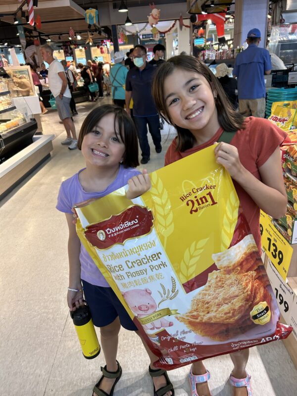 Thai pattongo turn out to be baby Chinese donuts, these but about 30cm long is what is served as a salty crunchy side to congee in Hong Kong! They are delicious, and the tiny size means they’re the perfect little treat. 5 in the bag means Joe and I both get two, Maylin takes the 5th while Téa prefers her nuggets over trying new things some days.