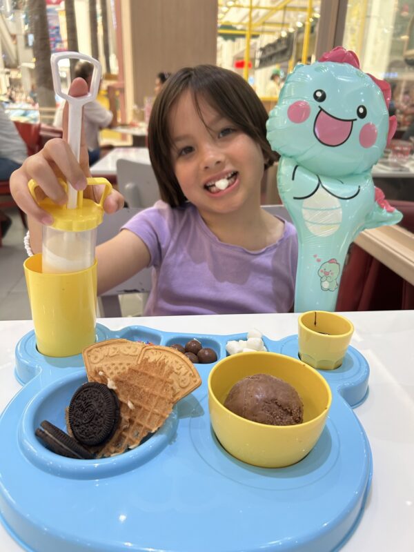 Joe has no luck. He decides to go back to Bluport and the grocery store there, which is great because I have had an idea and need to buy something behind his back. As soon as I say “who wants to go with dad to Bluport”, Téa jumps at the chance to spend some time with Joe. Which is also great for Maylin, because ever since Téa had that amazing DIY ice cream experience at Swensen’s, she’s wanted her very own ice cream afternoon with only mommy. So that’s what we do! Joe and Téa head across the street to the tuktuk bus, and Maylin and I sit down for ice cream!