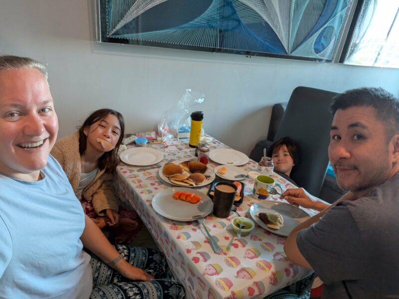 Once we’d uncovered all the paper bag surprises that the morning had brought, I started making the pancakes we had bought for this occasion. I picked up pandan custard at the grocery store the other day, and it is delicious with pancakes!