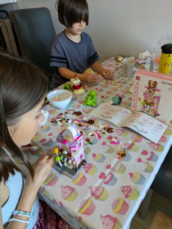 Our Christmas morning is the perfect relaxing affair. The girls unbox some of their gifts, and spend hours at the dining room table building a tall teddy bear house (Téa) and not one but TWO Pompompurin characters (Maylin).