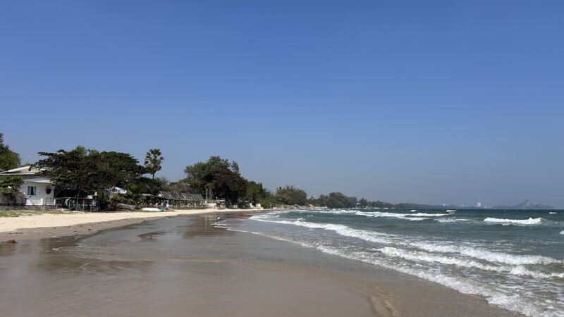 We stop in front of a super cute Beach Resort and Restaurant, and hesitate. Surely this can’t be the beach access for just anybody? But Joe says it is, so we enter the gardens. There are several buildings, and we walk past a pool with sunloungers, before we find the stairs down to the beach.