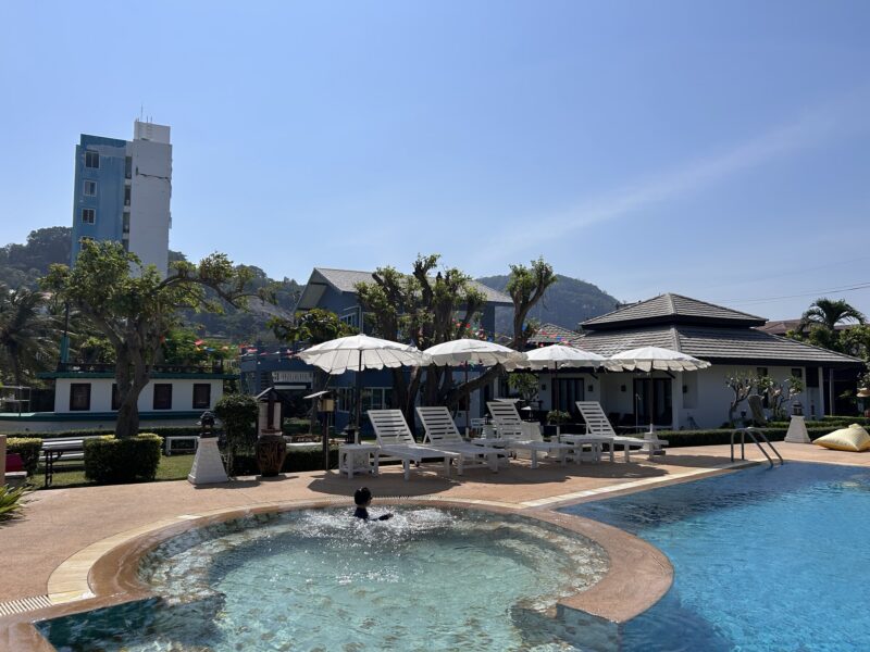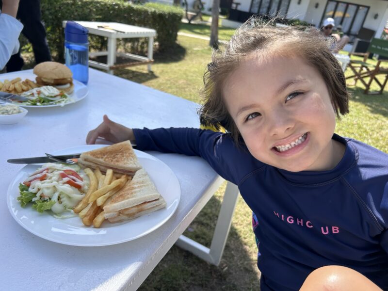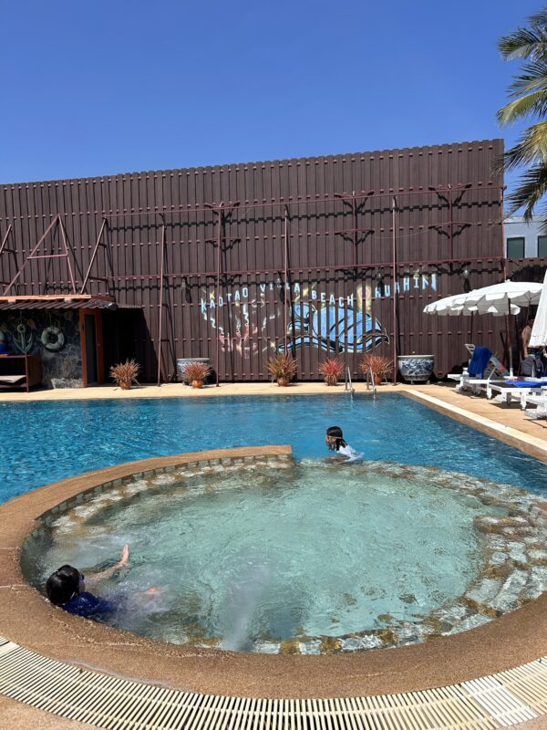 Joe sees a couple drive up to the resort on a motorbike, and go lay down on the sunloungers. Hey, if they can, maybe we can too? He goes to ask, and finds out that the pool, restaurant and sunloungers are for anyone to enjoy, provided we make a purchase from the restaurant. We order fruit smoothies and an iced tea, and the girls and I hop in the pool to cool off. It feels so refreshing after the hot, windy and sandy beach!