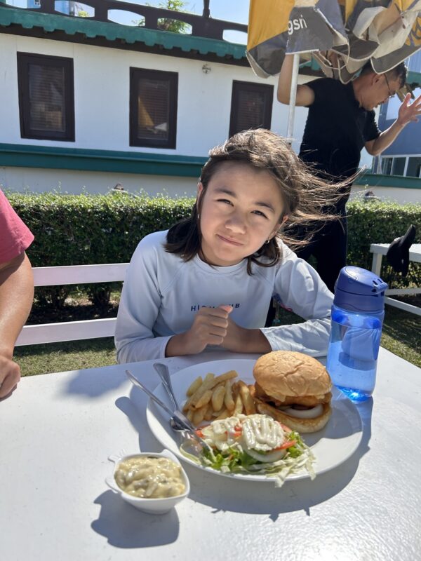 Joe and I fully expected the girls’ dishes to be too big for them, and for us to have their leftovers to add to our own lunch, but no such luck today. Our salad arrives, and it’s literally a small crab, deep fried in all its soft shelled glory, but it’s lettuce leaves and shaved cucumbers, which are NOT very heavy, and we share liberally with the lawn. The wind is adamant we are not having a full salad today.