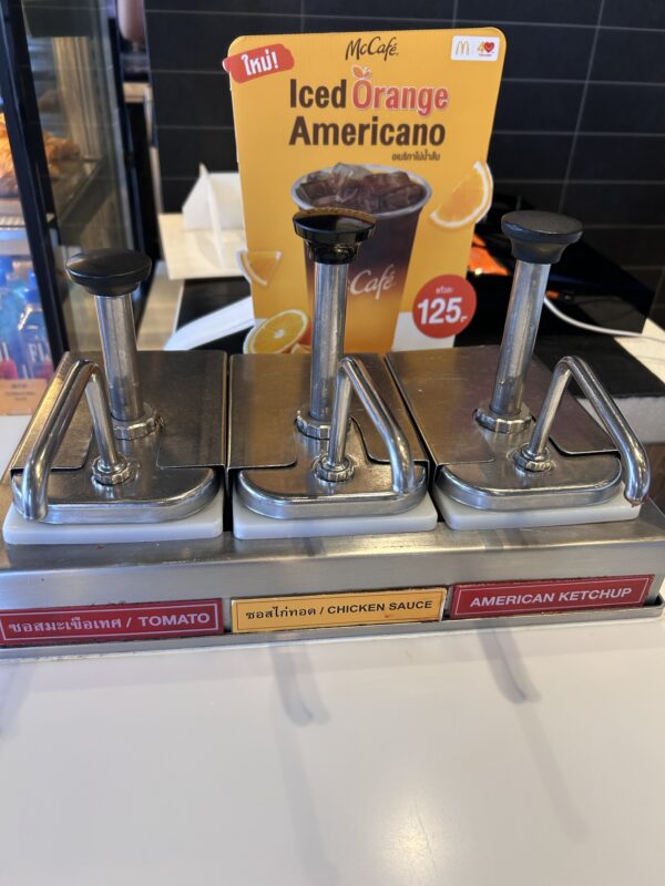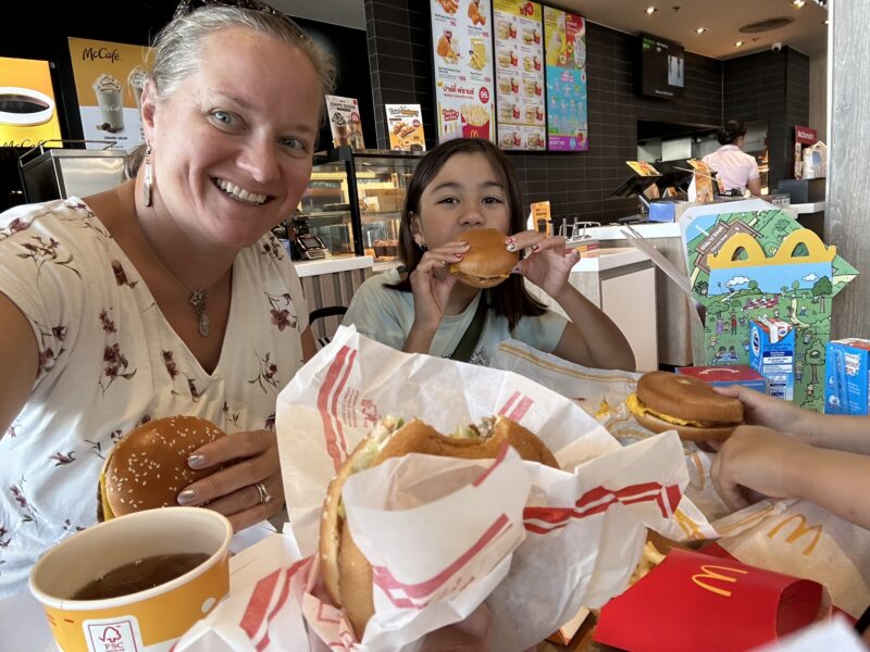 We aim for Market Village (I’ve been calling it Village Market lately, and the kids are so frustrated with me. I can’t help it when words mix up in my head!), and the girls are taking the opportunity to beg us to go to McDonald’s for a snack. We promised them we’d try McDonald’s in all the countries we come across, so I guess this is our Thai McDonald’s experience!