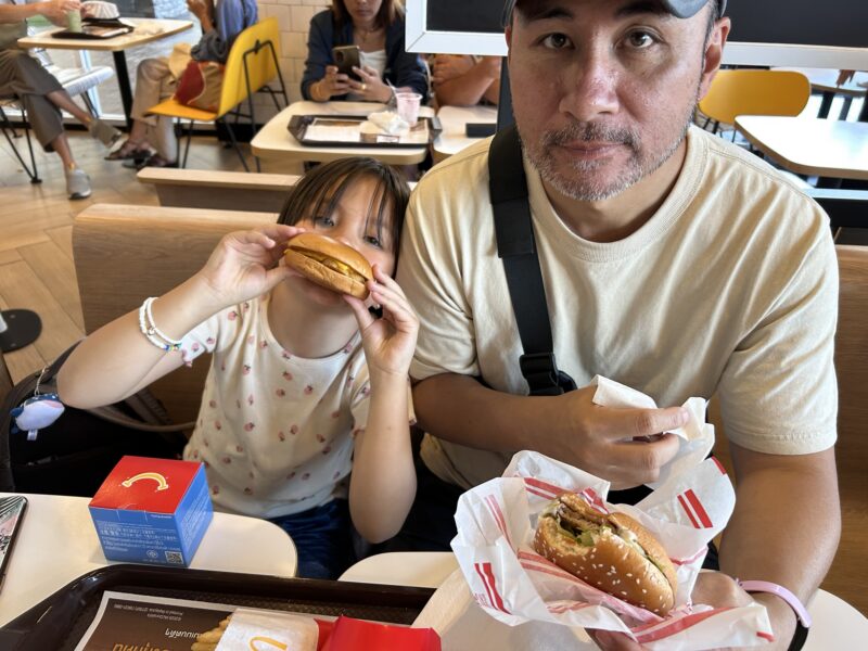 The girls get Happy Meals with (what I think is) cheeseburgers, fries, milk and a toy. Here, you can pick your own toy, and with there being two to choose from, they get one design each. I order a Quarter Pounder with some sort of parmesan cream sauce? And fries and an iced tea. Joe gets a Samurai pork burger, and plans to steal at least half my fries and drink.