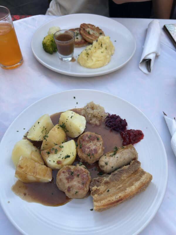 There was really only way this could go, a huge let down. The pork belly was cut into pieces and deep fried to warm and crisp it up. The pork skin was now deep fried shoe leather, and completely impossible for someone with a toothache to actually chew. The “medisterpølse” was ok, the “medisterkaker” were flavourless. I laughed to myself when I saw the vegetable portions – half a tablespoon each of the sauerkraut and redkraut, with a teaspoon of lingonberry jam. Disappointed, but still – in my travelling heart it’s all about curiosity. I will forever stay curious. I was so curious to try a Norwegian Christmas dinner on the other side of the world, in this tropical climate. I’m glad I got the chance to try it.