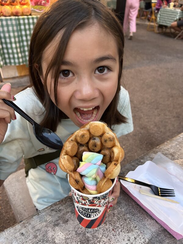 Téa survives her jump into the cold pool, but swims to meet me at the stairs and gets out pretty fast. The packed pool directly across the walkway feels like a hot tub in comparison, and so we find a space in there to play and have fun. I swim and play for a bit, then leave the girls to it while I try to blog from my phone on the side of the pool. It’s their last day swimming in these pools, and so I figure I’ll give them as much time as they want. I usually cap it at an hour in the pool, and today they last a full two hours.