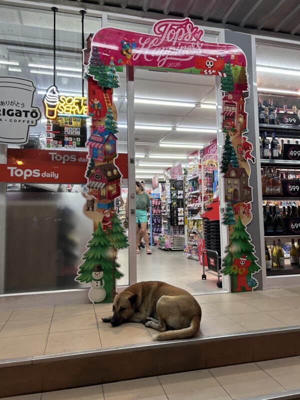 Joe and Téa stopped by the mango sticky rice lady for one last order, while Maylin and I walked on to Tops Daily. I was hoping to find a single bag of microwave popcorn, but only found the sleeping Tops dog.