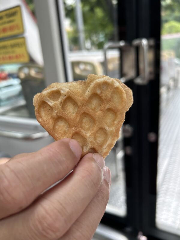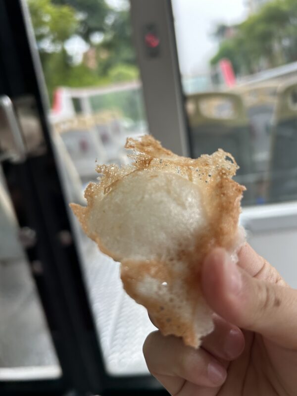 It’s getting hotter, and we still need to make it back closer to the hotel, have a real lunch and I’d like to brush my teeth before my dentist appointment at 3pm. We figure out that we can grab the next hop on hop off bus, which should be here any minute. Joe manages to grab some treats from an old lady vendor right in front of the market, and we bring these onto the bus.
