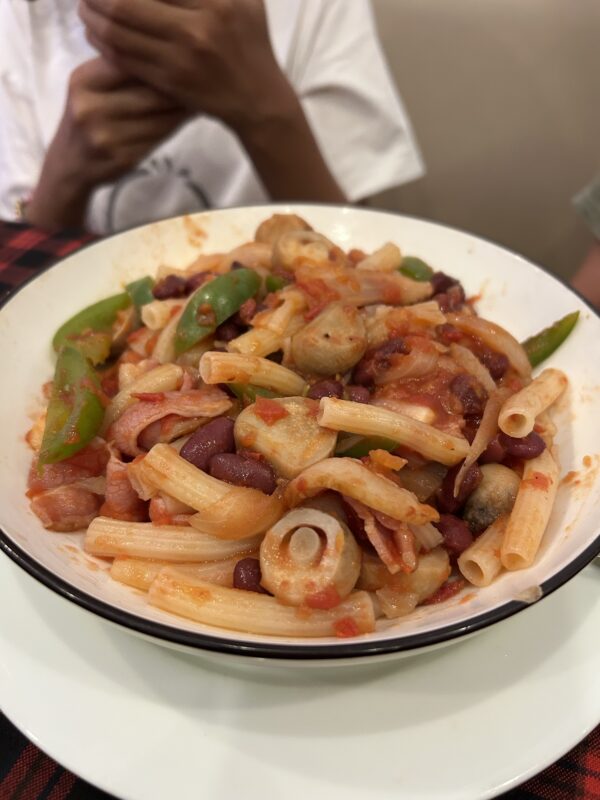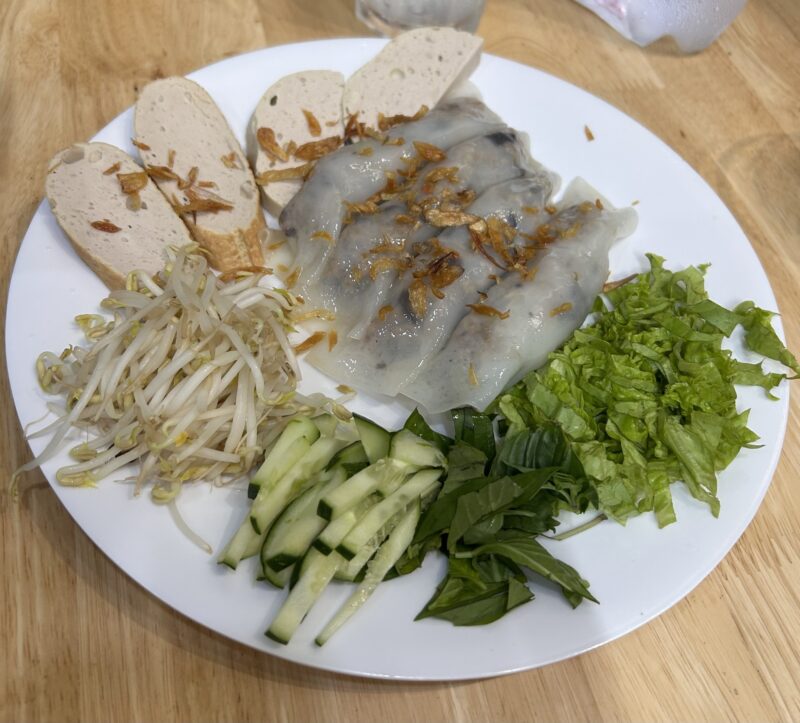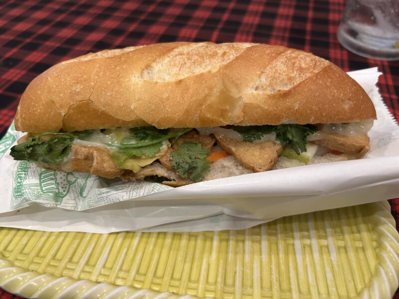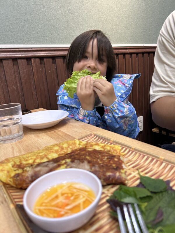 Once back across the big street, we found a restaurant and ordered some lunch. I ordered the vegetarian banh mi, because I still have a fear of stringy meat getting stuck between my teeth. Joe ordered the pork banh mi, and the girls ordered a bacon veggie tomato pasta to share.