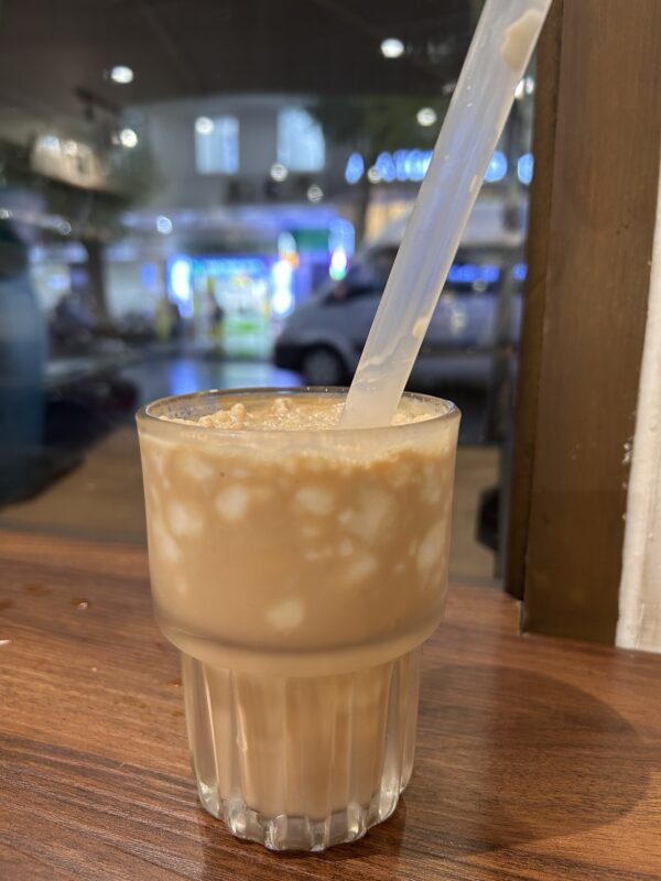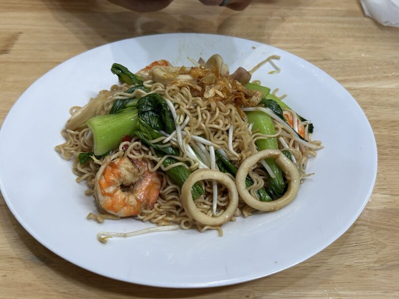 I have my next dentist appointment today, so I’m still kind of leaning towards the softer foods. I go for the egg drop-like soup again, and find that some of the cold offers have changed. The rice pudding-like dish has changed to rice noodle rolls that look like a knitted type of fabric. I have glass noodles (my favourite), a spring roll, an okra, I test the fish balls out, have a siu mai and a sweet potato. I grab two wedges of white “fruit” (I mean, it’s on the fruit tray, surely it’s a fruit?), which is very cruncy (think raw potato) and tastes like nothing. Absolutely nothing. Not sweet, not sour, just only crunchy. Must be good for my teeth, then?