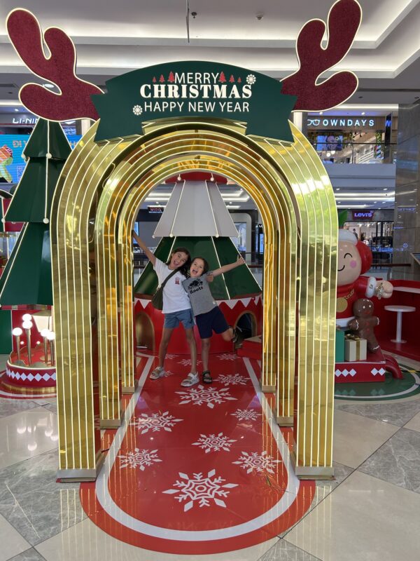 We figured out that what we thought was a mall entrance is more of a business tower entrance, with Chagee on one side and Starbucks on the other. (I’m not a fan of Starbucks, but I noticed their sign in the lobby: Business bundle – 4 beverages and 2 snacks, or 6 beverages and 3 snacks. Why don’t we have business bundles at coffee shops in North America? Or do we??) We are very ready for an indoor activity, and Joe has found a mall in the outskirts of town, promising to be as good as the impressive malls we found in Bangkok. We book a car, and head out of town.