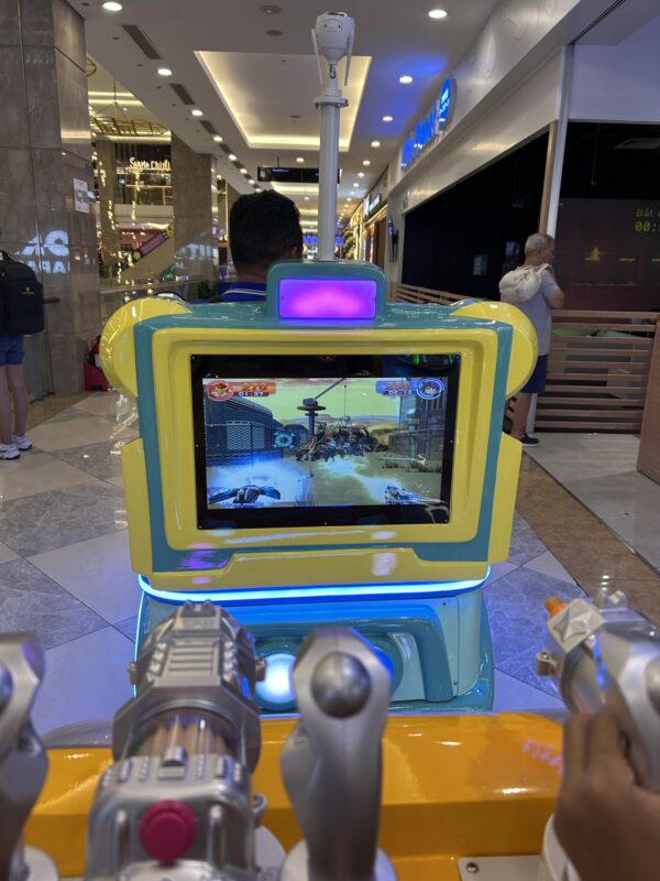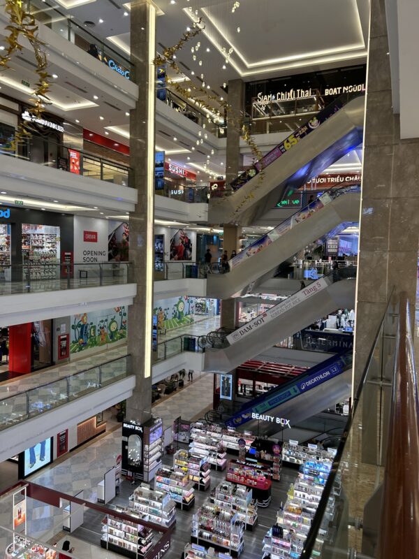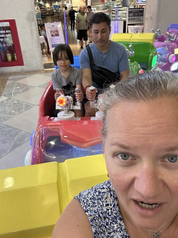 The Vincom Mega Mall – Thao Dien is a pretty mall, but it’s about 20 minutes out of the city centre, giving us the opportunity to see a bit of the city, and crossing two rivers. I love the taxi apps we’re using in Vietnam, both Grab and the fully Vietnamese Xanh SM are saving our feet from the heat in this country! Did you know you can pick your size of car, or even get a moped taxi? They store any “luggage” (small bag or crate of water bottles) in front of the driver’s feet, and then sit lazily at the back, with the branded helmet. We haven’t tried this type of taxi yet (for obvious reasons, what about the kids??), but would love to try it one day! I’ll try to snap a picture of one eventually…