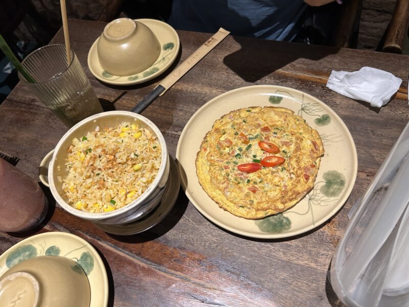 We figured out that the plate of greens and shrimp paste went with Joe’s noodle soup, but I kind of looked at them thinking I could make lettuce wraps there for a minute… Lunch was tasty and safe for my teeth, and both girls were filled up by their plates. Sometimes kids’ sets are too small for Téa, but that brick of broken rice was very dense, and both girls left about half.