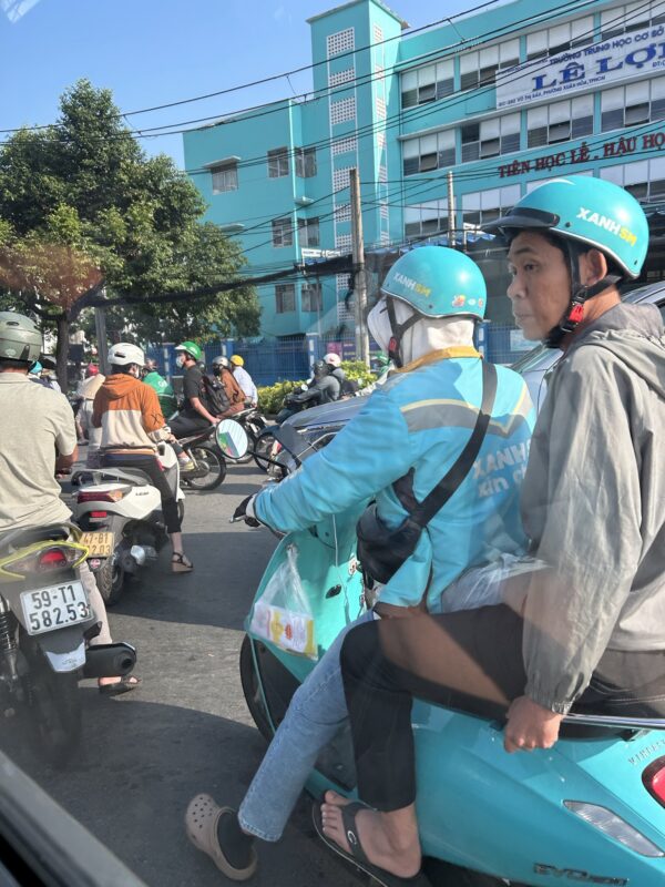 We’re packed and in the lobby shortly after 8am. We check out and hop in our “limo” (small SUV?). I’m afraid the luggage won’t all fit, but our driver manages the very intricate game of Tetris to fit it all in the back. We get stuck in a few traffic jams on our way to the station, and I’m finally able to snap a picture of a motorbike taxi! The taxi driver brings you a helmet, so you match the bike and the driver’s uniform.