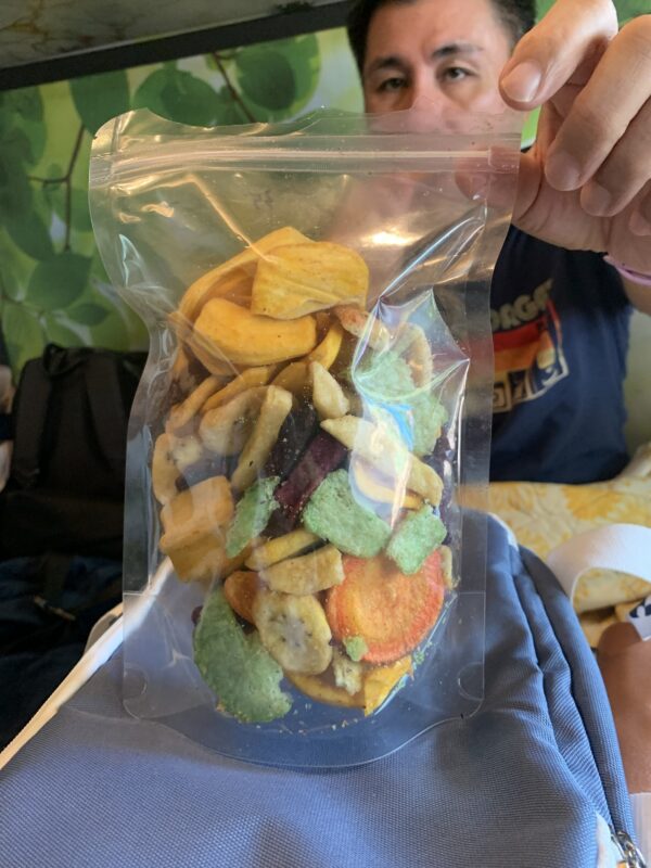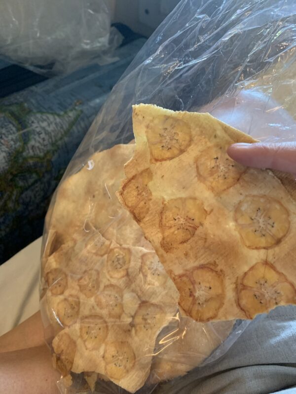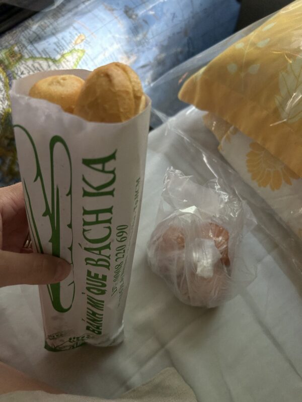 After the train leaves the station and maybe 15 minutes into our journey, our door is wrenched open. The coffee cart lady is here! Thank goodness, Joe can have his coffee! We also buy a banh mi and I ask for the boiled eggs. We get three hot boiled eggs and a tiny baggie of mixed salt and pepper in a plastic bag, and two very skinny baguettes with a meat paté.