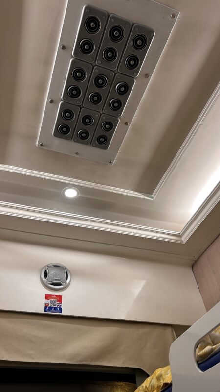 Once on the train and in our cabin, I find the train information binder on the table. I flip through and find a menu at the back. Lots of items are printed, but when I scan the QR code in the cabin to order food delivered, there is no coffee available! For a moment there, Joe gets very nervous, and seeing as we still have 15 minutes left until departure, I contemplate running out to the stall on the platform… I decide not to, not worth the risk.