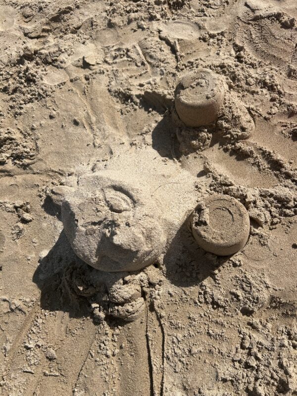 After school work is all done, we put together a quick lunch at home, and then head to the beach. Joe and the girls go down first, I have a cold and do not feel great. I am blogging up a storm, trying to catch up and give myself the three day buffer I’m used to having. Once I’m caught up to where I want to be, I walk down and join them. They’re having a blast in the waves! They’ve also been busy with sand creations this afternoon, and are very proud to show me what they call their “turtles”: