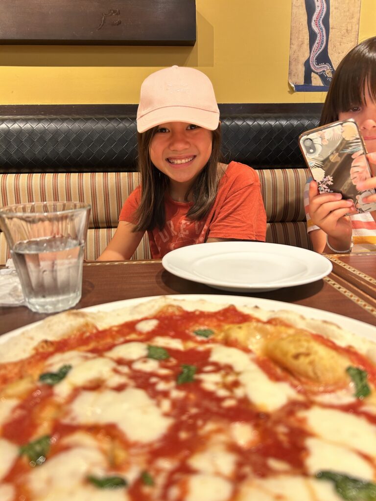 Shopping done, we are ready for dinner. We head to the 8th floor, where it’s all restaurants, and allow the girls to let their craving for pizza win tonight. The Umeda area has lots of Italian restaurants, and we find one with the thinnest crust pizza. The girls share a tomato, mozzarella and basil pizza, while Joe and I ended up with a pizza chemically free from cheese, somehow. It had tomato, oregano and garlic, to which we added octopus. When did you last have octopus on your pizza? I promise, it was delicious!