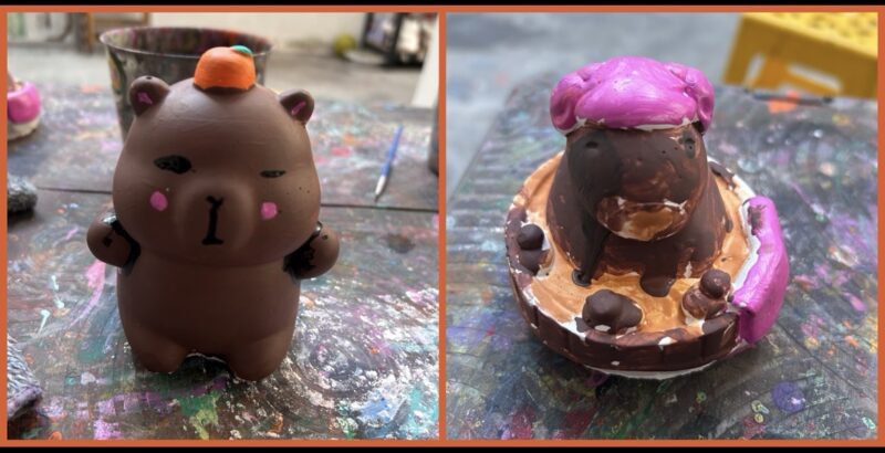 The girls are loving this climbing experience. Maylin tries to climb an especially challenging outcropping and takes a fall, which means it’s time to switch activities. Téa, our creative mind, has been wanting to paint here since we first discovered this place, but her sister has never wanted to join her. Until today! Both girls pick a capybara figurine, and sit down with paints and brushes.