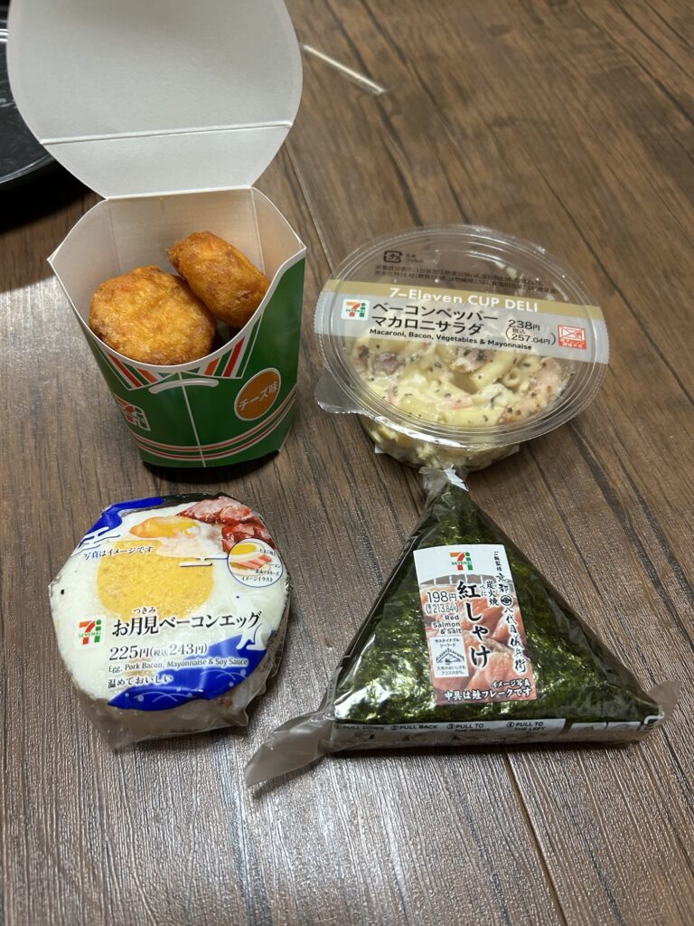 After “school”, the girls and I headed to 7Eleven for some simple lunch items, and I challenged myself to keep it under CA$10/¥1000. The girls decided to share a macaroni salad and some chicken nuggets, I chose an onigiri for myself, and picked an egg and bacon on rice for Joe. ¥973 in total, so that was a success!