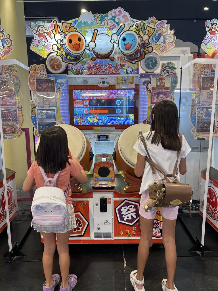 Once at the mall, we took a thorough look through the Disney store, then decided it was time for a snack break. One crepe with almonds and chocolate (me), one vanilla and chocolate sundae (Téa) and one vanilla mango sundae (Maylin) later, and we were all recharged to continue on our explorations. Of course there was also an entertainment area, with the claw machines, gachapon and video games that entails, and Mommy has a really hard time saying a strict NO, so I gave them each a ¥100 coin and said they got to do ONE thing. They chose the drumming game again, and as much as I don’t like waiting around in these entertainment areas, they really have so much fun with this particular game! I liked it as well when I tried it, I see why they like it!