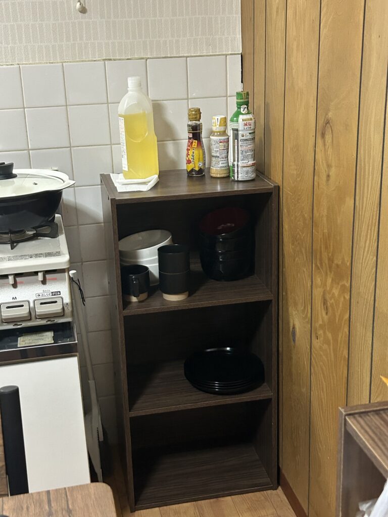 Our AirBnb host shipped another shelf for the kitchen, so I built that and left it for Joe to “move into”. We needed to get our cups and plates out from under the stove, and it fits so well in the corner of the kitchen.