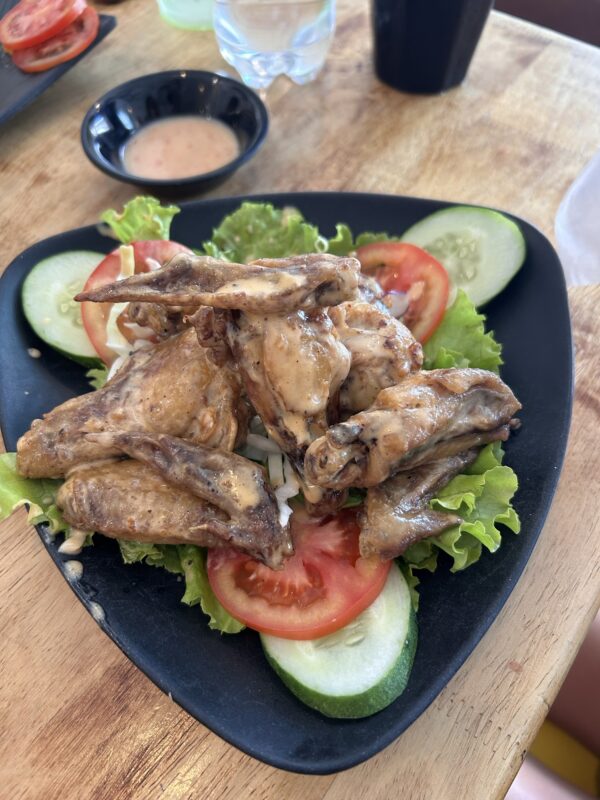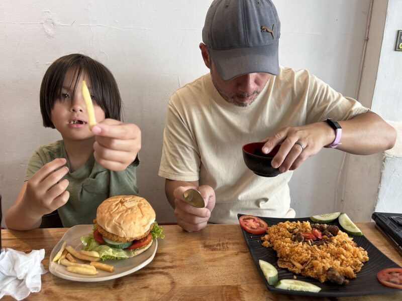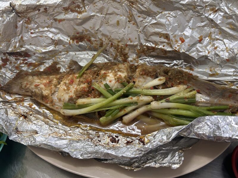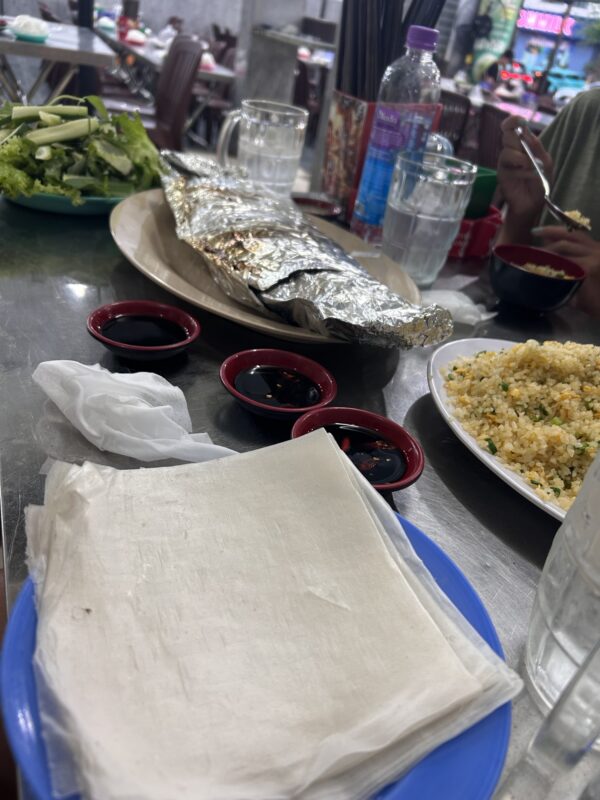 We sit down at the restaurant, on teeny tiny plastic chairs, and tonight the place is not full. I’m guessing because it was Sunday, it was packed with all the locals? Tonight it’s just us and a couple of other tables, and they’re all local. Staff still doesn’t speak English, so asking for clarifications doesn’t really work well. We place our order, steamed fish for Joe and I, and egg fried rice for the girls. There is another fried rice option, but it doesn’t translate to anything understandable, so we don’t dare order it.