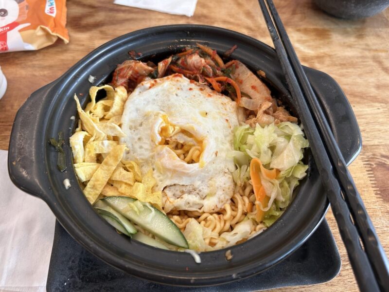 The only answer is lunch. We go for a walk, just to see what’s out there. We walk left, then right and another right. We went looking for one place, only to find it closed, so ended up visiting the kind of Korean restaurant that we saw that time we went to the actual Korean restaurant on the other side of the street. This place has pizzas and burgers, is it really Korean?
