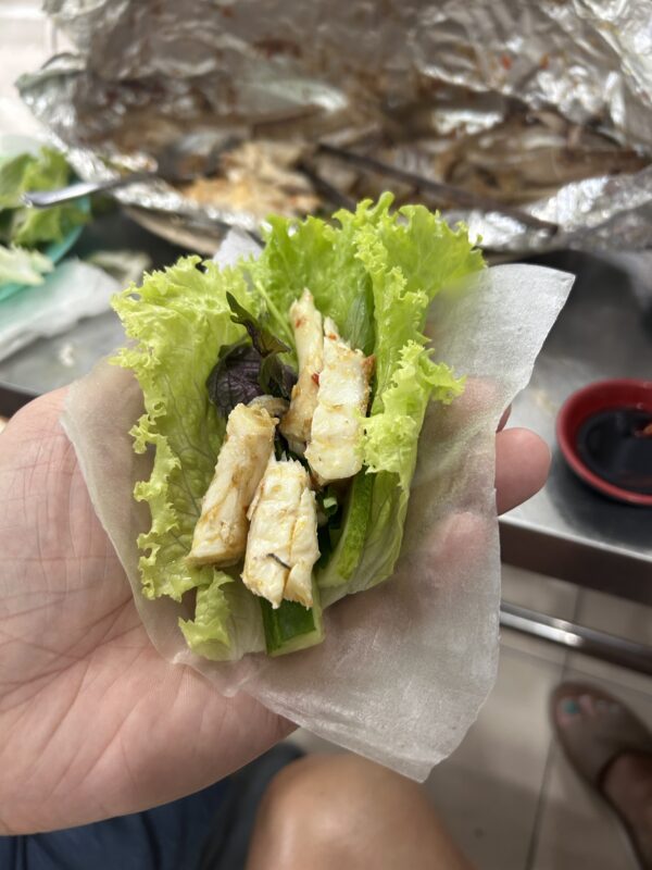We thoroughly enjoy our meal. We sit crouched on our chairs, wrapping fish and veggies, dipping rolls, while the girls enjoy their rice. They try the fish, but yell “spicy, spicy!” and turn back to their rice. We observe what other tables do, and wonder what they ordered, as their foil wraps are so much smaller than ours. We watch as a table of tourists walk in and try to make sense of everything, and we feel like old regulars already.
