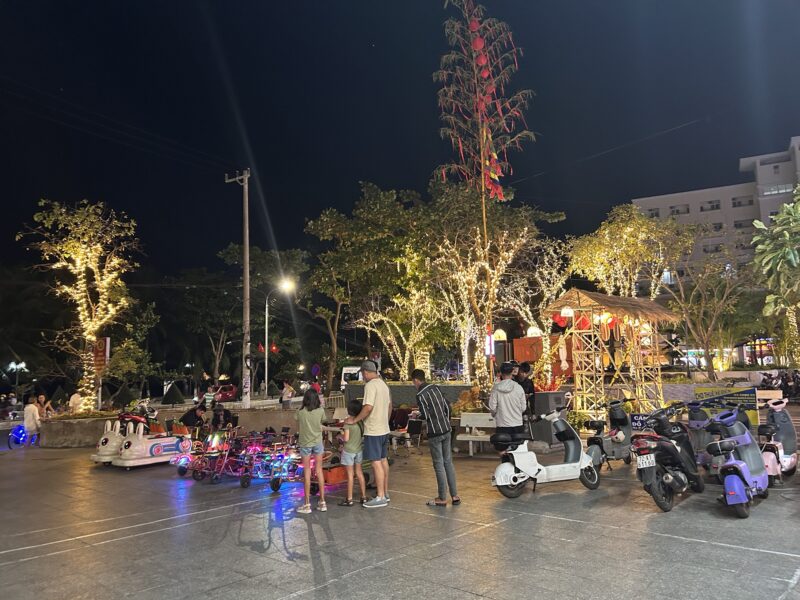 Coconut ice cream lady is not back. Coconut ice cream lady’s friend, the fishballs on a stick lady, is looking around, it looks like she’s been tasked with looking after the second cart “for a bit”. She gets on the phone when she sees we are back and looking at the coconut ice cream cart again, and she’s yelling. Then she turns the coconut ice cream cart lights off, and her own cart lights off, and stomps away. I guess there’s no coconut ice cream for us today.