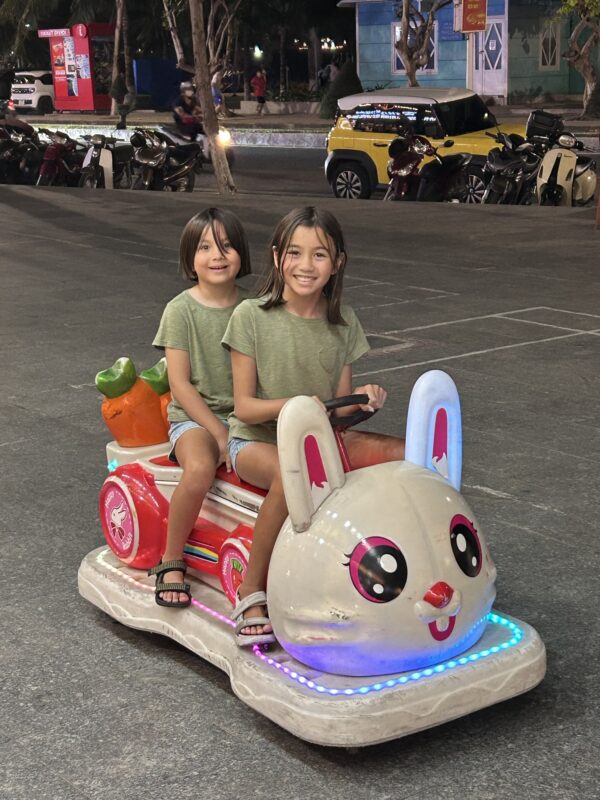 After dinner, we decide to take a walk. I want another coconut ice cream from the beach coconut ice cream lady, and so we aim for that area. Every night that I’ve taken the girls out, they’ve begged me to ride the colourful baby rides outside our building. Every night, I’ve told them no, we’ll do it a night when Joe is with us. Well, tonight he’s with us, and the girls excitedly decide on a vehicle.