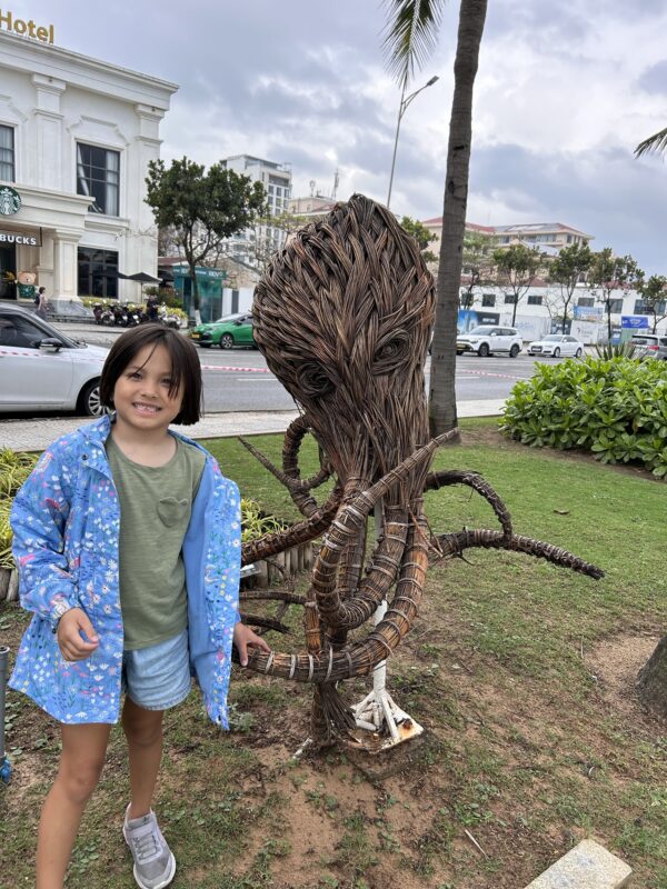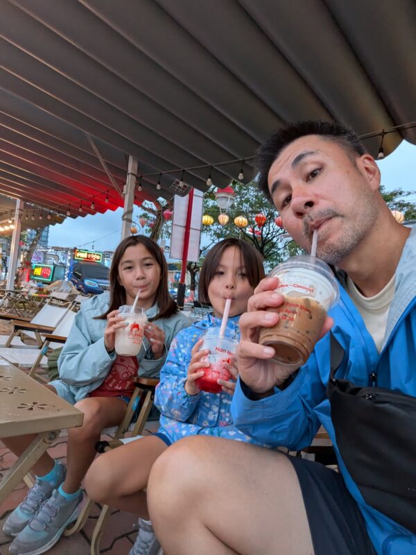 Joe and I both have Vietnamese coffee, and Téa has a hot chocolate. We spend some time at the café, and then we decide to go for a walk. The skies are grey, and it just stopped raining, good thing we have our rain jackets!