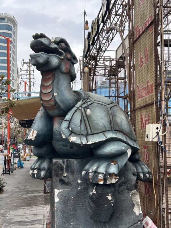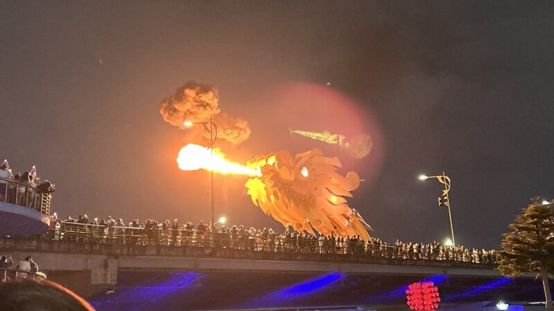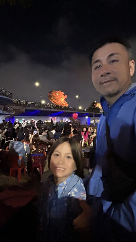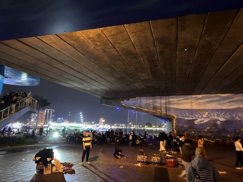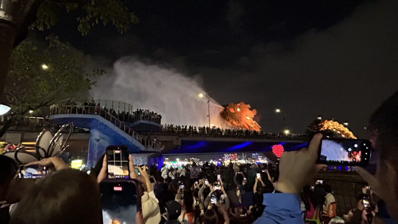 The road and sidewalks on both sides of the dragon bridge, as well as the bridge itself, are full of people. So many drinks vendors make instant restaurants by setting up little plastic tables and chairs, all lined up for the best possible view of the show. The crowd is just holding its breath waiting for the show to start, and we are all here for the very same thing.