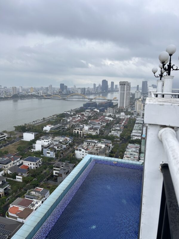 When they come back, it’s almost time for lunch. But first, we explore the hotel. On the 24th floor there’s a spa, but it’s also the last floor that the elevator goes to. The 25th and 26th floors are up some very tall stairs, as in each step on the stairs is a tall one. My thighs ache, and I’m only just walking stairs! On the 25th floor, there’s a bar/restaurant and an infinity pool, unfortunately not heated, but the girls think it feels ok anyways. We may test it out later. On the 26th floor, there’s the garden dining room, attached to the bar/restaurant below. The 26th floor has no roof. When it rains, the rain goes down the stairs into the 25th floor, and the bottom step has a grate to drain the water away.