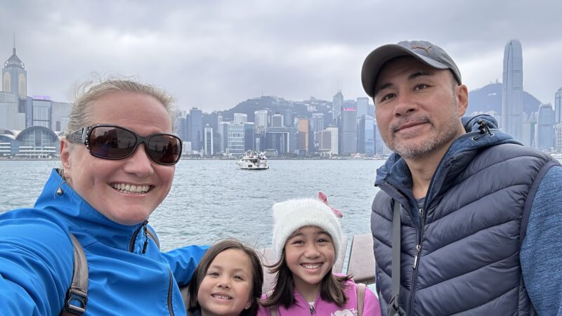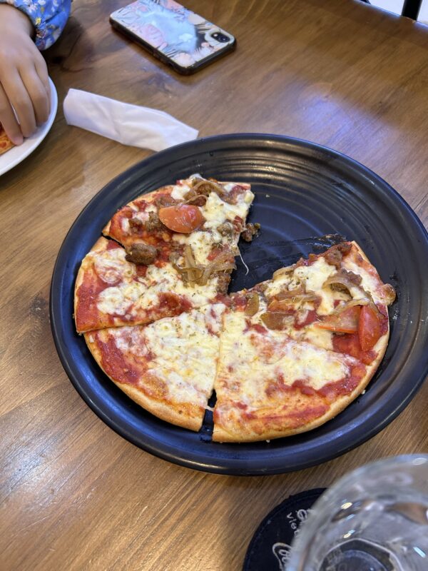Once satisfied that the rooftop is not close enough for us to properly enjoy the fire and water show on the dragon bridge, we head down to the lobby. We take a taxi over to a mall to escape the rain, and hopefully find some food. I am feeling horrible still, and do not want anything to eat. Joe lets the girls choose the restaurant, so we end up at an Italian place with pasta and pizza. The girls share a small pizza, and Joe has a seafood spaghetti.