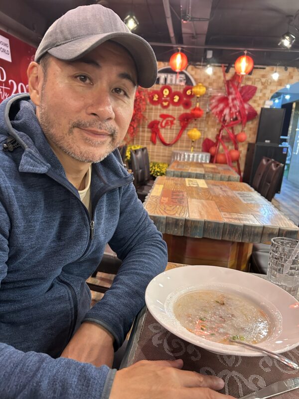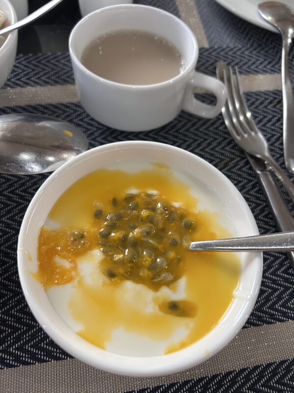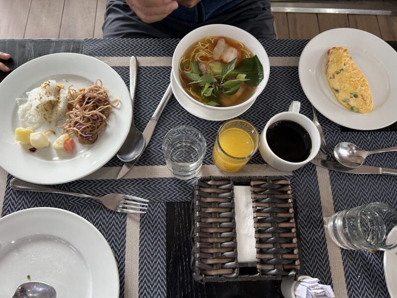 We take the elevator down to the 4th floor and step into the breakfast restaurant. There’s a window for eggs to order, there are bowls of noodles, veggies and meat (they only pour the soup over as people ask for it), there are platters of raw salad veggies, and a potato salad that Téa grabs a bunch of, only to realize it doesn’t taste like Mom’s potato salad, at all. There are breads, desserts, white rice, sticky rice, fried rice, congee, soup, curry, steamed bacon, hot dogs and pasta. There are steamed frozen veggies, stir fried vegan options, cereals, juices and super strong Vietnamese coffee.