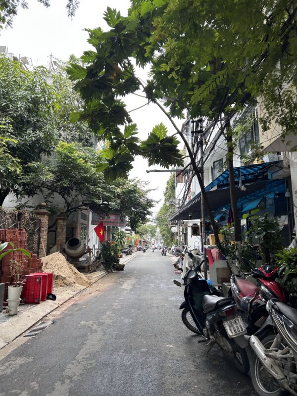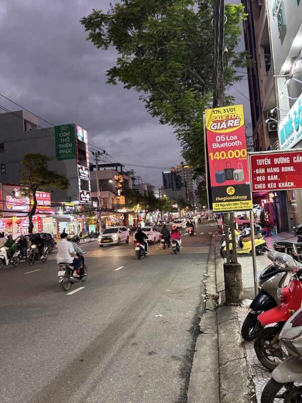 We cross the river and walk along busy roads. Suddenly, we enter an alley way and find a calmer street a block off the busy area.