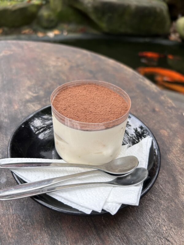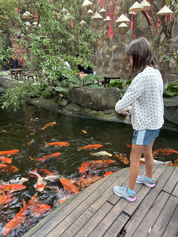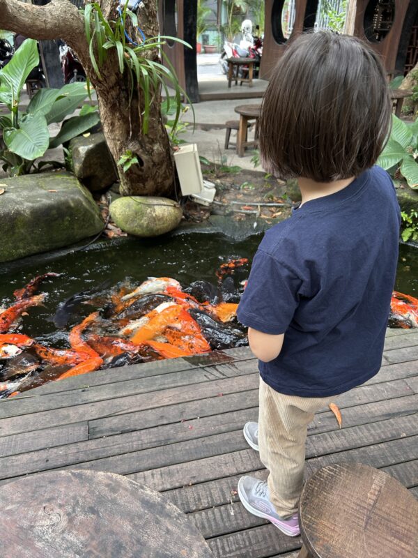 The café is a koi café, a popular option to draw customers. This one is like a calm little garden inside a huge café, with a koi pond stretching the length of the block. The café counter is at the very back, so at least you get to see all your seating options before taking your pick. We choose to sit on a little platform in the middle of the koi pond, and they actually sell koi food at the café, so we’ve got everything we need!