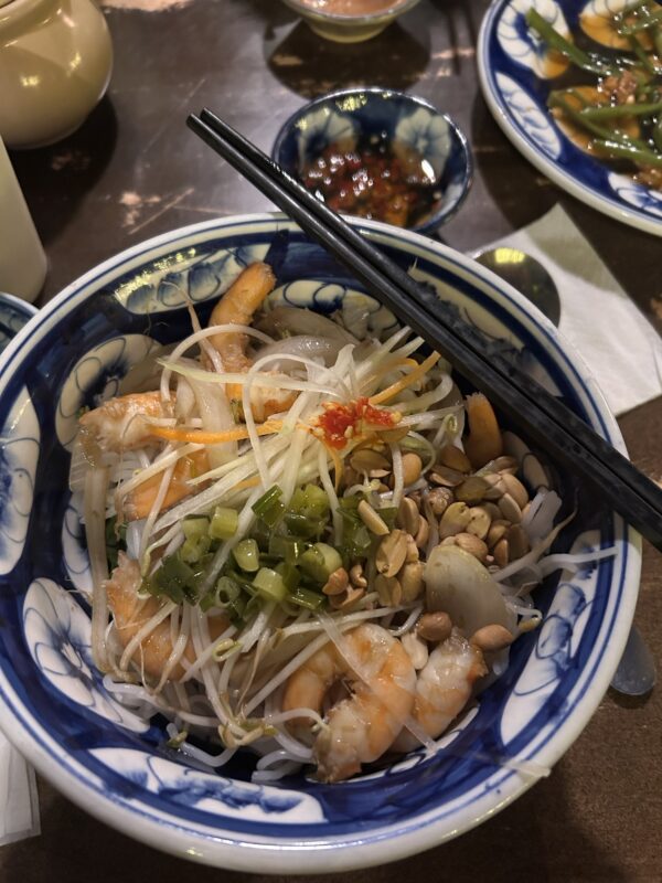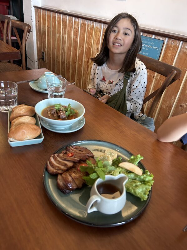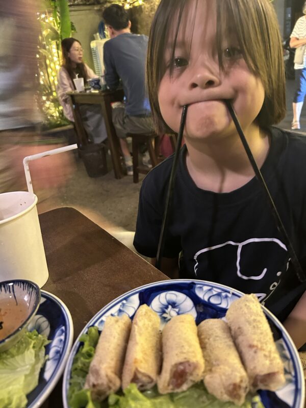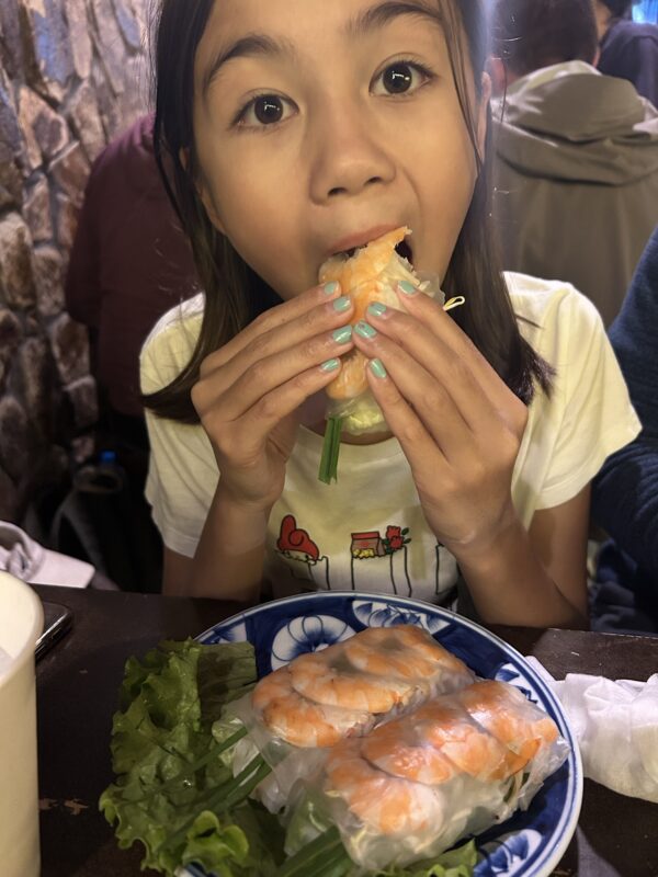 We absolutely roll out of the restaurant in the end. It was such a delicious meal, there’s no room for dessert. We absolutely did not need the 5th dish, the plate of vegetables. As the evening progressed, Joe finished Maylin’s spring rolls, Téa’s summer roll, and my noodles. Next time I think we’d cap it at four dishes, if not three…