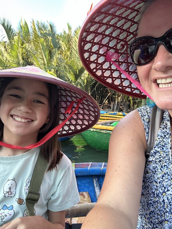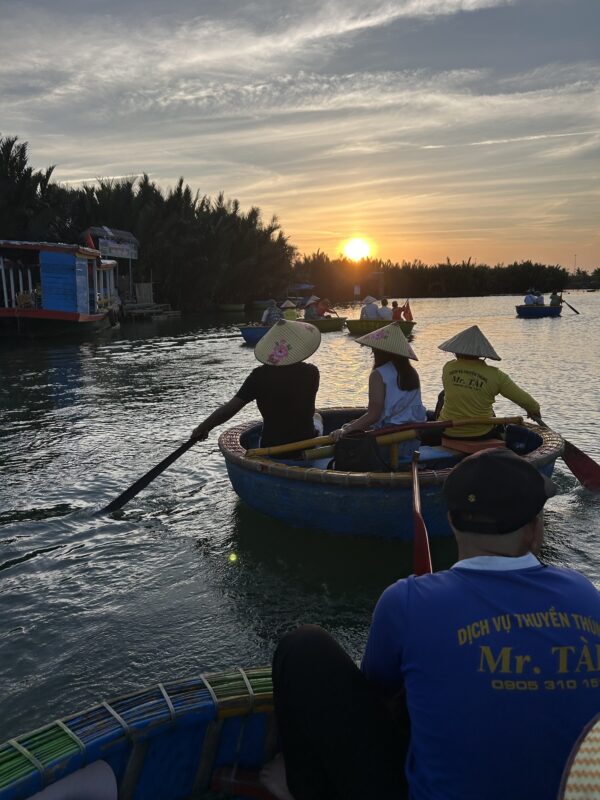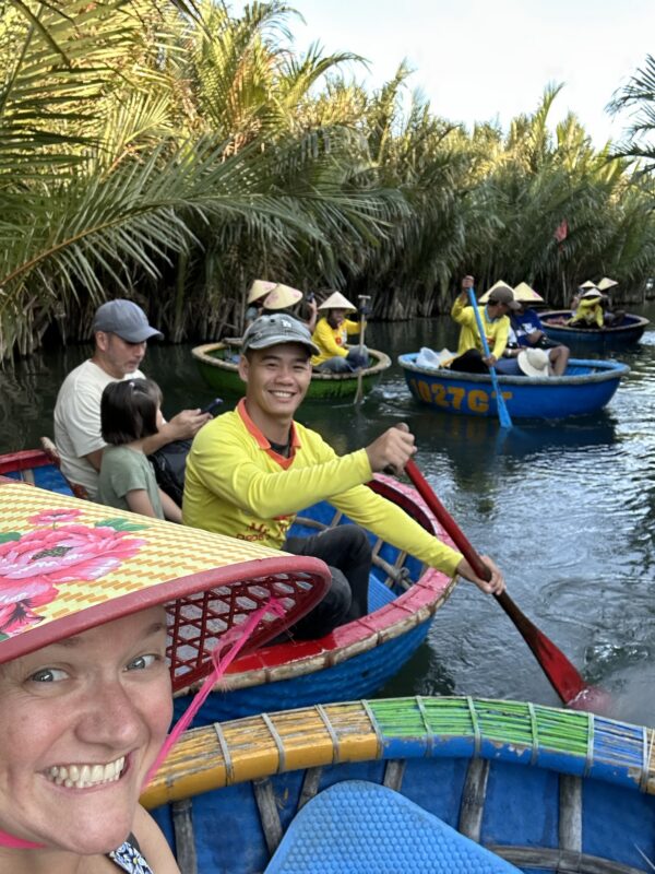 After we climb back down from the Marble Mountains, we go back onto the bus, and we are now headed for the Coconut Forest to go ride some boats. Joe has been watching the videos, and keep scaring us with stories of rocking the boat. We don’t want no rocking boats, thank you very much!
