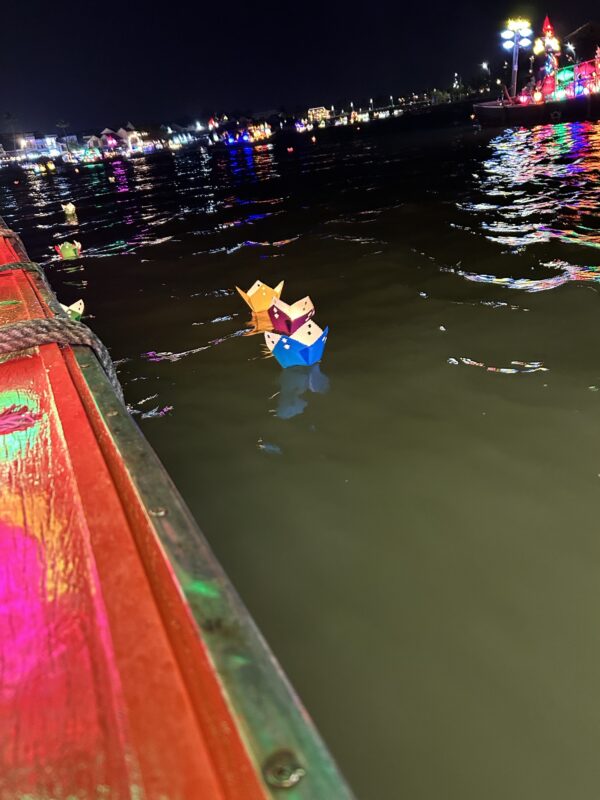 After dinner, we were free to roam the streets of old Hoi An. “Ancient Town” Hoi An is another place completely focused on tourists and their cash. You are met immediately by ladies selling you their boat’s services, and we are brought to the harbour. All the boats are lined up, but our lady’s boat is currently with tourists, so it’ll be here in “one minute, one minute”. Everything is rush-rush, everything is “here, I’ll give you this so you can’t run away, you have to use our services now”. The girls are suddenly holding our lanterns, which we have to bring onto the boat to make our wishes. It’s so very rushed!