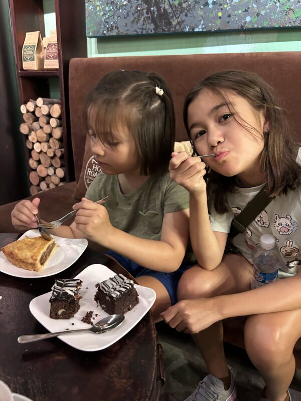 And then Maylin says “Mom, I need to go pee”. We’ve passed opportunities on our way here, but of course, once it’s necessary, they’re nowhere to be found. And that is how we chose our coffee shop for dessert! There’s a big bright WC sign at the end of the café, and suddenly we’re staying for dessert.