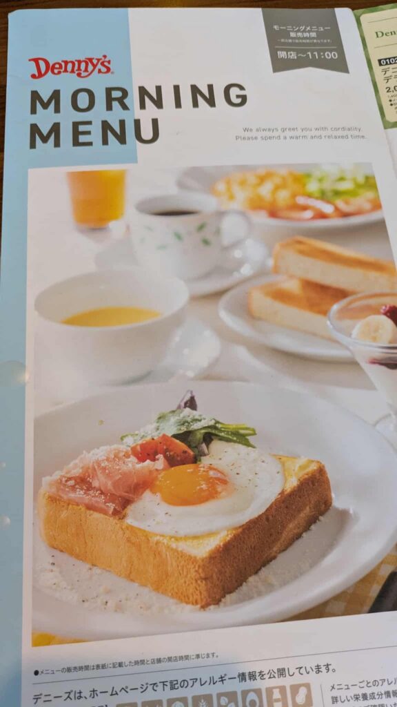 Denny’s staff spoke very little English, but made up for it with large enthusiasm and printed English menus. Ordered through a tablet at our table, and got our drinks at the open Drink Bar. Iced coffees and teas, all unsweetened, espresso drinks from a machine, and a Coke freestyle dispenser for pop, orange juice and Maylin’s new favourite, Calpis. The milky, sour and super sweet beverage was not my favourite, and definitely not something I’ll suggest she try for breakfast again…