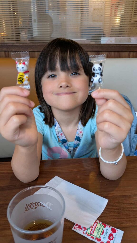 Oh, and the cutest thing happened at breakfast! A Japanese older gentleman, obviously a regular, came over to our table with the wet wipes from the drink bar, after noticing that we hadn’t grabbed any for our kids. He was such a sweetheart for showing us how it’s done in Japan in the kindest way possible. He returned a few moments later with candy gifts for the girls, souvenir style chocolate balls wrapped in panda and lucky cat wrappers. Super cute, and making us wish we had listened to all the suggestions to bring tiny Canadian souvenirs to gift in lieu of tips around the country. We didn’t know, but we know now, although it’s too late for this trip.